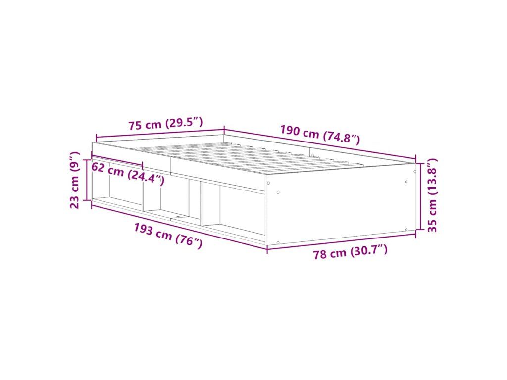 - Vhodný rozmer matraca (matrac nie je súčasťou balenia): 75 x 190 cm (Š x D) (2FT6 malé jednolôžko)