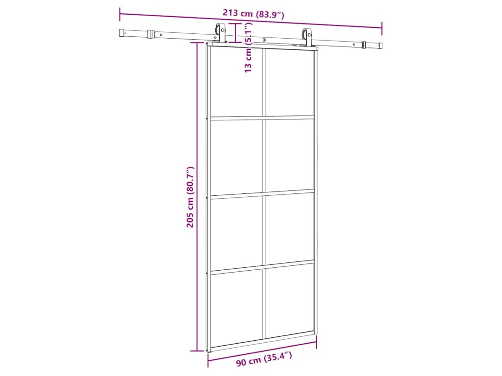 90 x 205 cm (213 cm sliding rail)