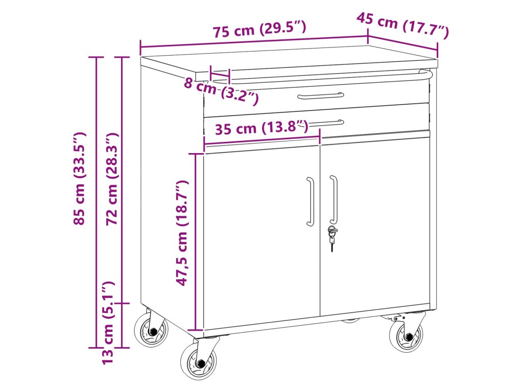 - Univerzálne úložisko: S oddeleniami, zásuvkami a policami ponúka rozmaznávané organizačné možnosti. Tieto komponenty umožňujú efektívne usporiadanie náradia a materiálov, optimalizujúc priestor, takže všetko je pekne na svojom mieste. Jeho odolný dizajn je skvelý pre rôzne úložné potreby, od veľkých nástrojov po drobné doplnky, takže je nevyhnutnosťou pre organizované pracoviska.