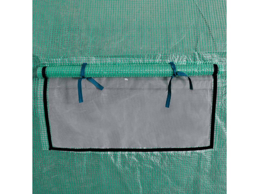 Fóliovník má predné dvere s dvojitými zipsami, ktoré sa dajú zrolovať a umožňujú bezproblémový vstup a dobré vetranie. 8 okien (4 na každej strane) s rolovacími krytmi zabezpečí priečne vetranie počas horúcich dní.