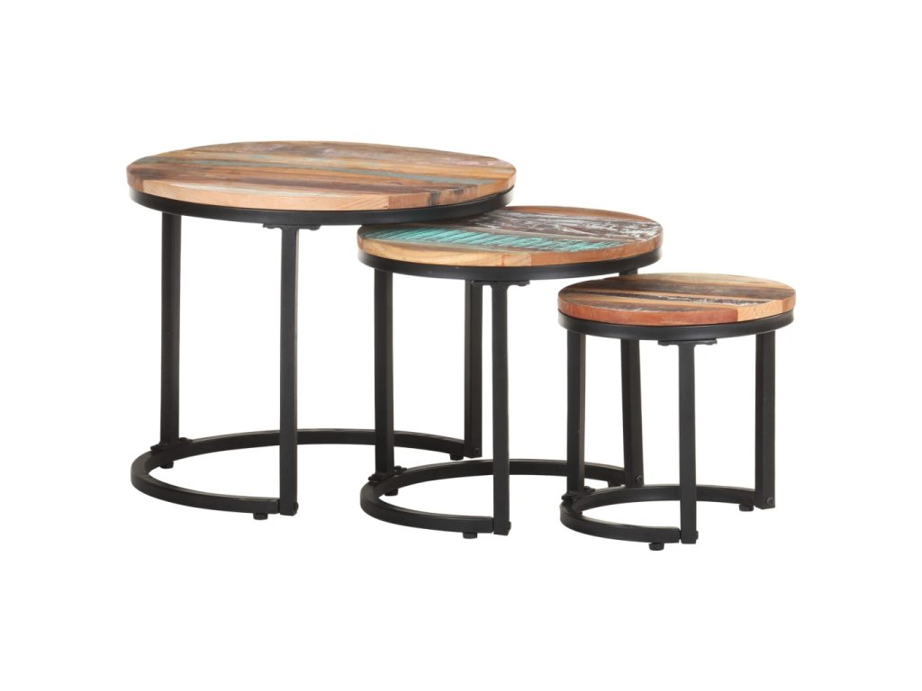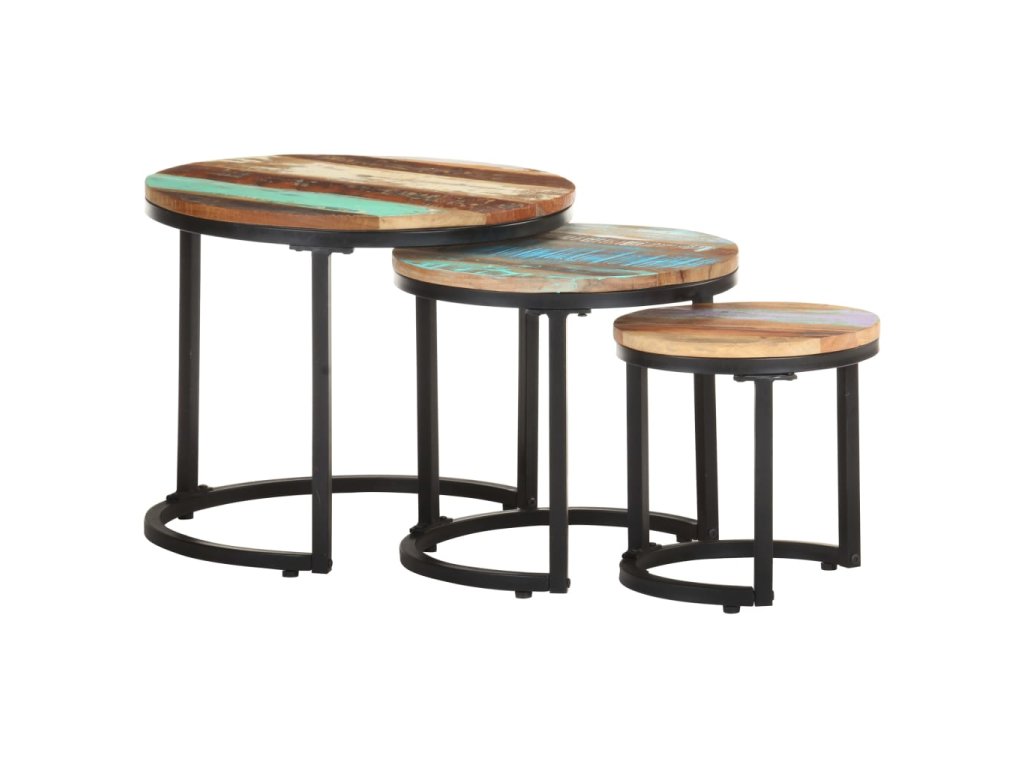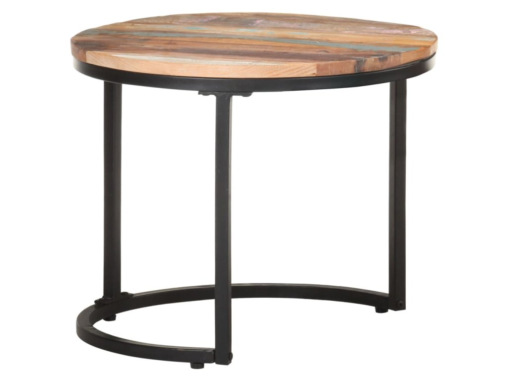 Doska stolíka je vyrobená z recyklovaného masívu pochádzajúceho z trámov, podláh a nosných trámov zo starých zbúraných budov. Môže pozostávať z rôznych druhov dreva, ako je borovica, teak, dubové drevo, mangovníkové drevo, akáciové drevo atď. To znamená, že regenerované drevo si zachováva vlastnosti týchto rôznych druhov dreva. Drevo je už odležané, zvetrané a vysušené, preto sa nezmršťuje ani neohýba. Pevná stolová doska navyše poskytuje stabilný a bezpečný povrch, na ktorý môžete umiestniť rôzne predmety. Práškovaný lakovaný železný podstavec zvyšuje stabilitu stola. Stolíky môžete dať k sebe alebo oddeliť, aby vyhovovali vašim potrebám, a navzájom ich vnoriť, aby ste ušetrili miesto, keď sa nepoužívajú.