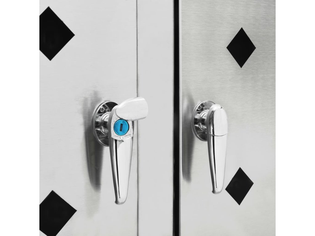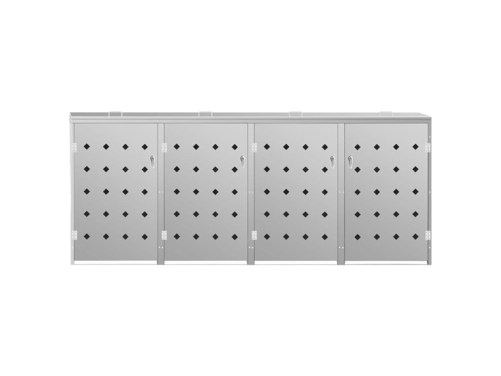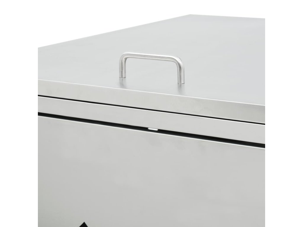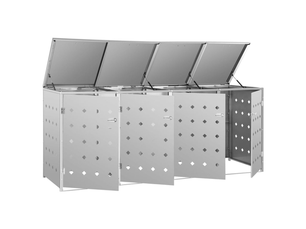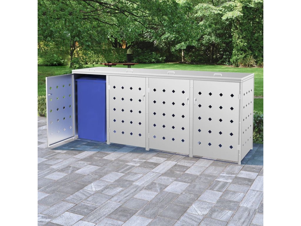 Prístrešok na smetný kôš z nehrdzavejúcej ocele je pevný a extrémne odolný voči poveternostným podmienkam. Užitočné vetracie otvory umožňujú cirkuláciu vzduchu, a zabraňujú tak nepríjemným zápachom v prístrešku na smeti. Systém zamykania zaisťuje bezpečné skladovanie odpadu. Smetný kôš môžete ľahko vyvážať vďaka praktickým dvierkam.