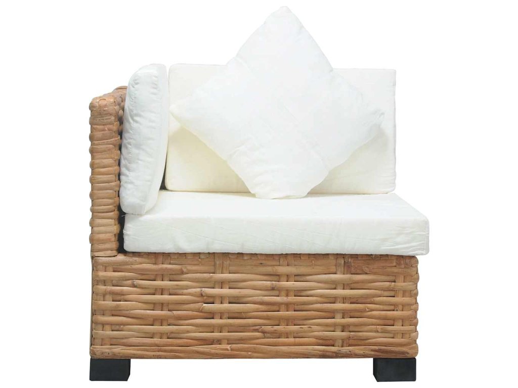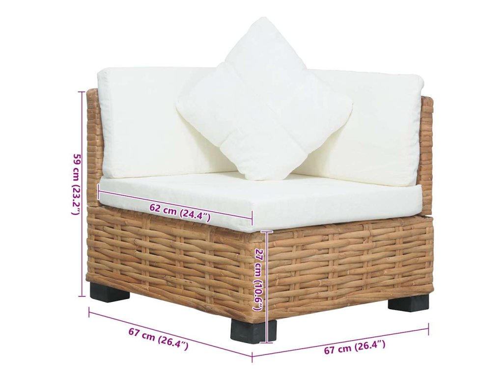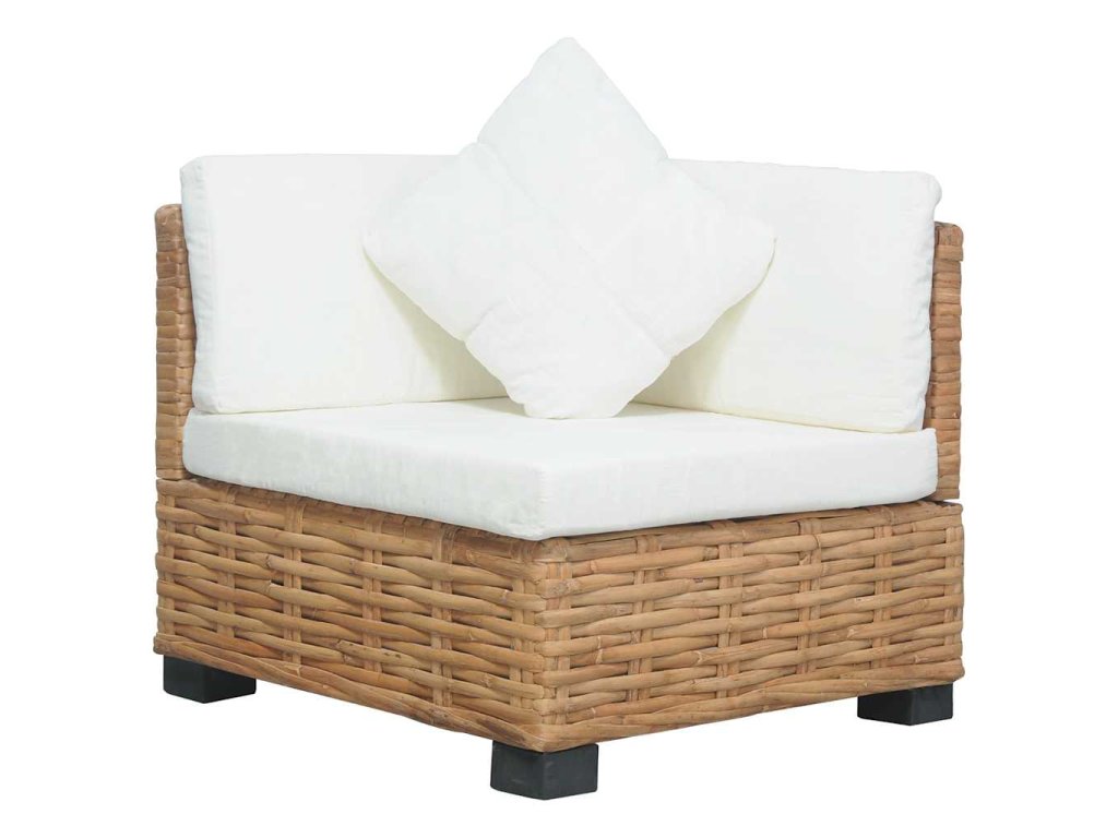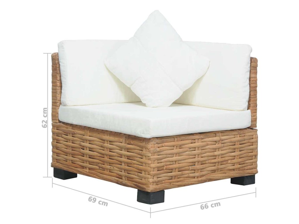 Rám je pokrytý prírodným ratanom, ktorý je nielen atraktívny svojím prirodzeným vzhľadom a vyžarovaním, ale aj ozdobnými vlnkovanými vzormi, no je aj veľmi trvácny. Nohy pohovky sú vyrobené z mahagónového a mangovníkového dreva, čo pohovke dodáva pevnosť a stabilitu. Vankúše prispievajú k pohodliu. Rohová pohovka sa dá jednoducho zostaviť. Balenie obsahuje 1 rohovú pohovku, 1 sedák, 2 vankúše za chrbát a 1 vankúš.