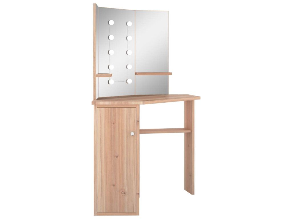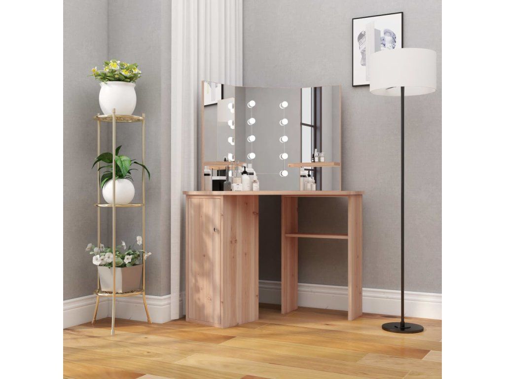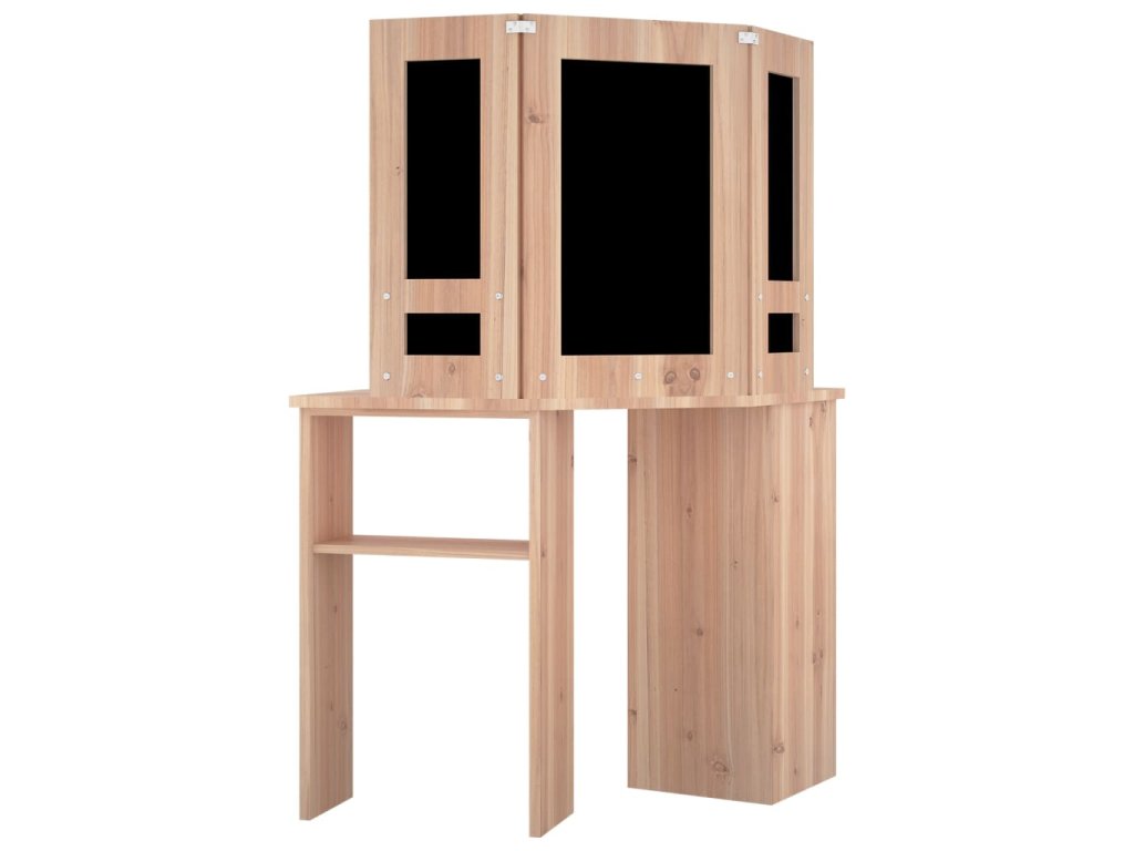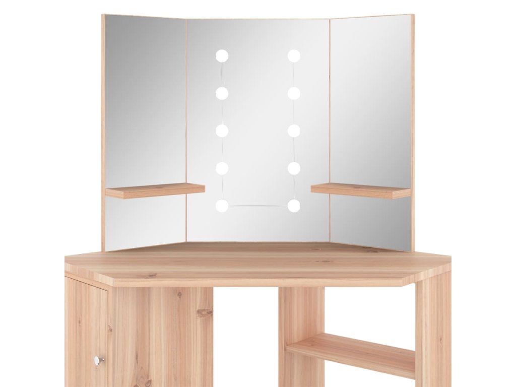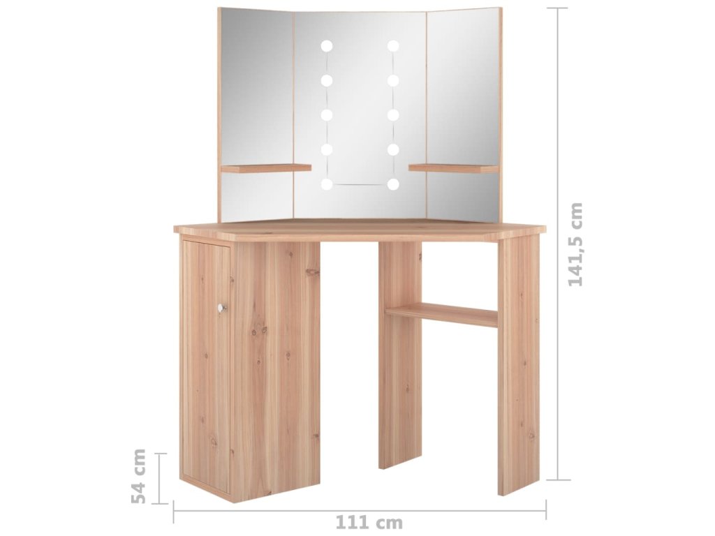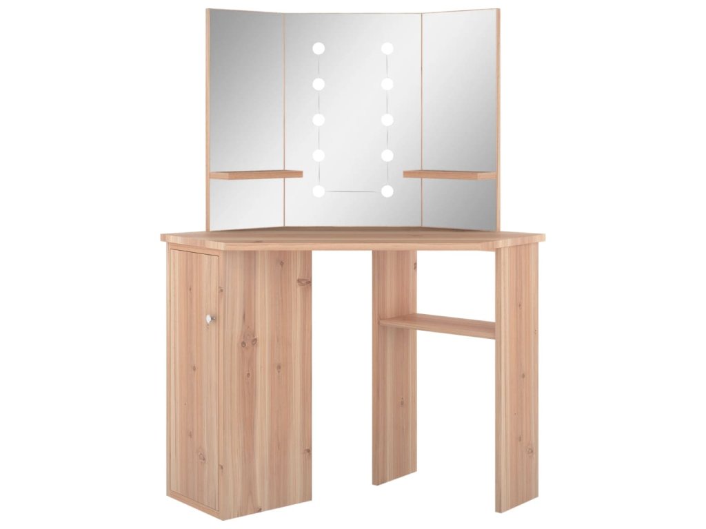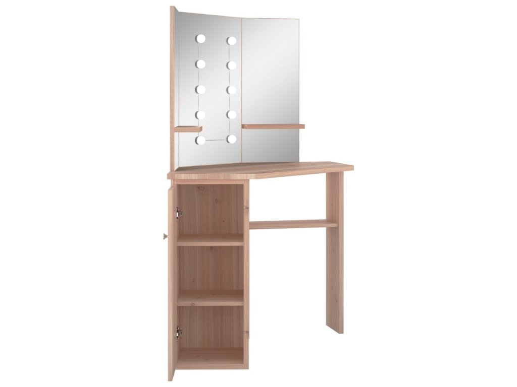 Tento toaletný stolík, vyrobený z kvalitného MDF, zaujme elegantnou siluetou a jednoduchými líniami v modernom štýle. Je navrhnutý tak, aby sa pohodlne vošiel do rohu a zároveň ponúkol na malom priestore veľa úložného priestoru. Priestranná skrinka a otvorená polica pod stolovou doskou slúži na prehľadné uloženie líčenia a kozmetiky, a keďže sa otvárajú do strán, máte k nim jednoduchý prístup aj keď sedíte pri stole. Krásne 3 panelové zrkadlo vás odráža z 3 strán pre pohodlnú aplikáciu make-upu a zároveň dodáva stolíku elegantný vzhľad. K dvom bočným panelom sú pridané spodné police na fľaštičky, štetce na líčenie, krémy, parfumy a dekoratívne predmety. Elegantné LED diódy vám poskytnú optimálne osvetlenie.