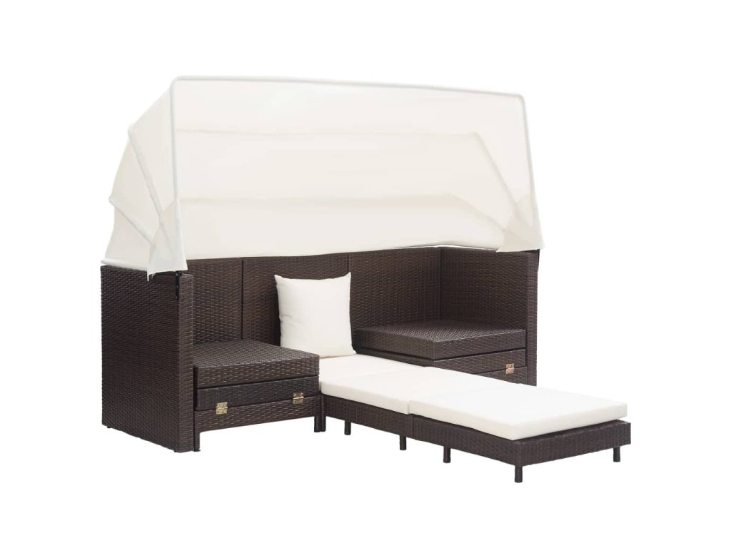 Vďaka PE ratanu, ktorý je odolný voči poveternostným vplyvom, je rozkladacia pohovka ľahko čistiteľná, odolná a vhodná na každodenné používanie. Oceľový rám s práškovou povrchovou úpravou zabezpečuje, že je pohovka pevná a stabilná. Mäkké, husté čalúnené vankúše sú veľmi pohodlné a robia z pohovky perfektné miesto na oddych. Táto pohovka sa dá podľa potreby ľahko zmeniť na rozťahovaciu pohovku pre jednu, dve alebo pre tri osoby. Strechu môžete použiť ako slnečník. Pohovka sa dá jednoducho zostaviť.