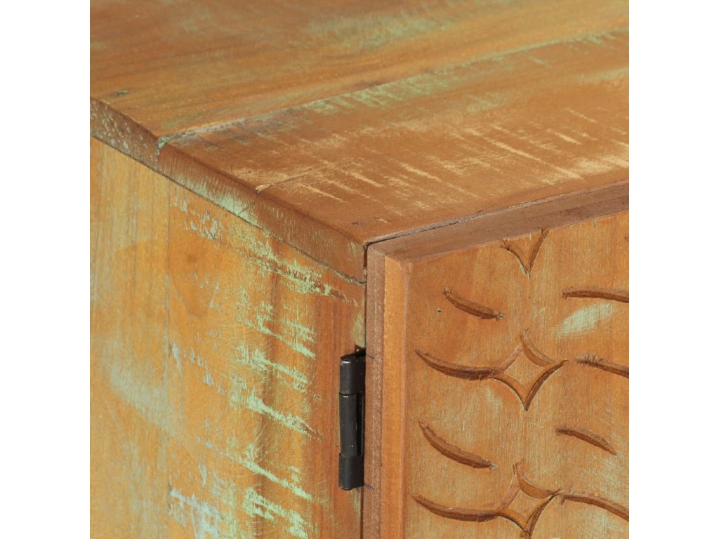 Farebná skrinka na Hi-Fi vežu so starožitným ručne vyrezávaným vzorom je vyrobená z recyklovaného masívu, ktorý pochádza z trámov, podláh a nosníkov zo starých zbúraných stavieb a pozostáva z rôznych typov dreva, ako napríklad borovicového, tíkového, bukového, dubového, cédrového, mangového či akáciového dreva. Recyklované drevo sa preto vyznačuje vlastnosťami týchto typov dreva. Recyklované drevo je staré, zvetrané a usušené, a preto sa nezmršťuje ani neohýba. Každý krok výrobného procesu sa vykonáva s maximálnou starostlivosťou, či už je to leštenie, natieranie alebo lakovanie. Vďaka vynikajúcemu remeselnému opracovaniu a krásnej textúre dreva je každý kus nábytku výnimočný a trochu odlišný od ostatných. Táto skrinka na plazmovú televíziu vo vintage štýle navyše obsahuje 2 dvierka, 1 zásuvku a 1 priečinok, ktoré poskytujú ideálne miesto na odkladanie menších predmetov, aby ste ich mali vždy poruke. Nízka skrinka sa jednoducho montuje.