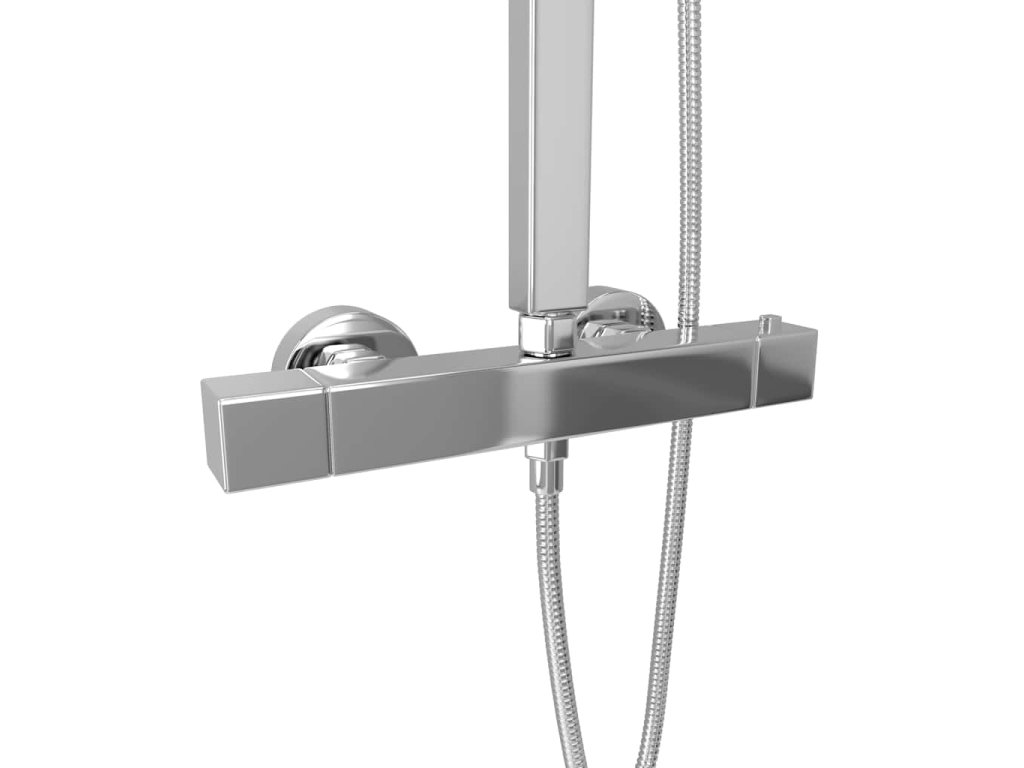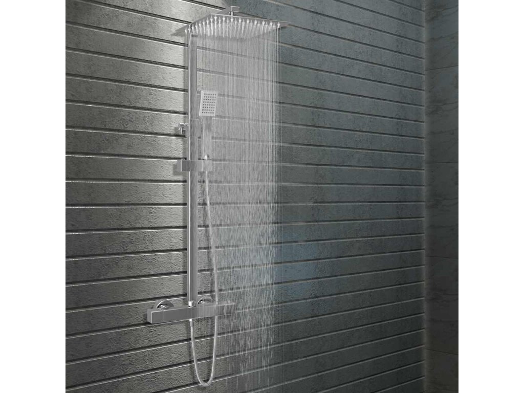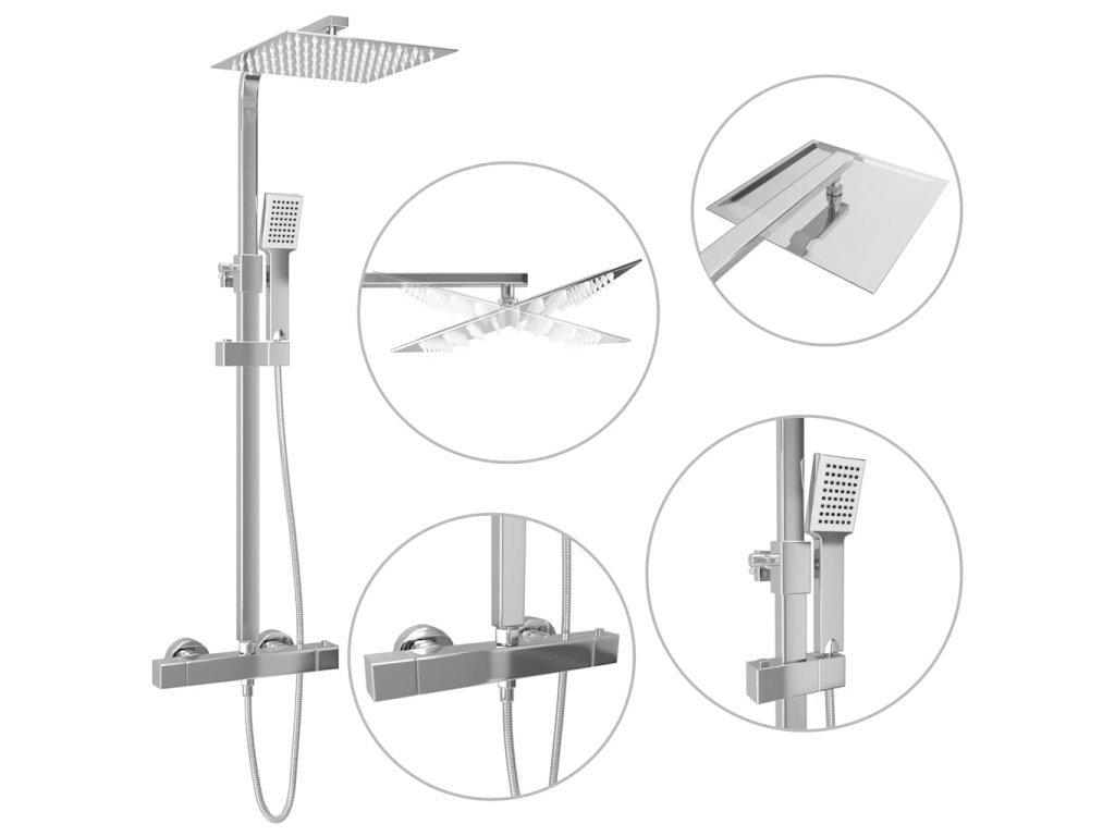 Pohodlná kompletná sada sa skladá z dažďovej hlavice z nehrdzavejúcej ocele a ručnej hlavice, ktorá je vyrobená z pevného ABS plastu. Nastaviteľná sprchová hlavica a tyč môžu byť prispôsobené vašim potrebám aj po inštalácii. 81 trysiek na dažďovej hlavici a 48 trysiek na ručnej hlavici poskytujú rovnomerný prúd a úplné pokrytie vodou. Mosadzný termostat a integrované zariadenie proti obareniu s 38 stupňami zabraňujú kolísaniu teploty a zaisťujú bezpečnosť a pohodlie počas sprchovania. Ľahko čistiteľný systém zabraňuje usadzovaniu vodného kameňa na tryskách. Okrem toho sú hadice vybavené aj systémom proti skrúteniu. Keramická kazeta je bezúdržbová a odolá voči každodennému používaniu, čo zaručí dlhú životnosť. Pribalená tyč sa dá namontovať pomocou skrutiek a iného montážneho materiálu, ktoré sa tiež nachádza v balení.