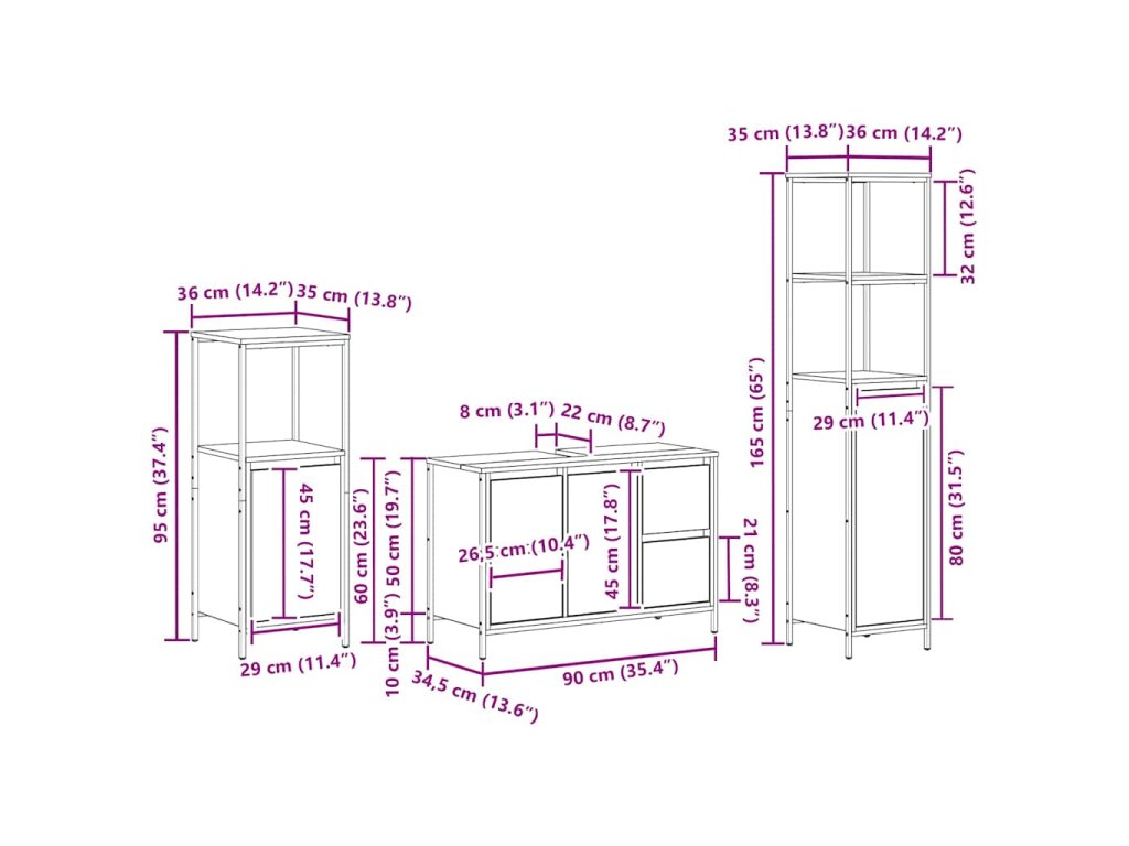- Praktický dizajn úložiska: Set ponúka množstvo úložných možností s rôznymi zásuvkami, poličkami a dverami. Udržujte poriadok s dostatkom miesta pre všetko, od uterákov po toaletné potreby. Premyslená konfigurácia umožňuje rýchly prístup aj diskrétne úložisko.