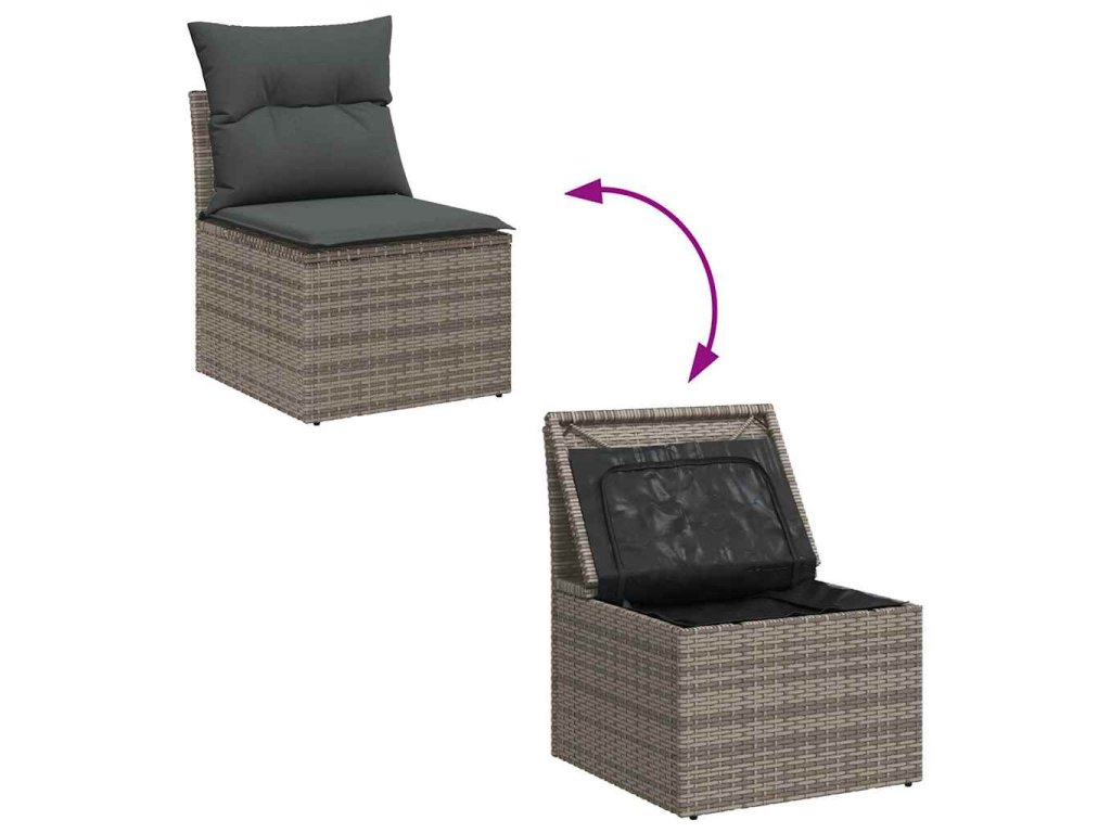 - Všestranné komponenty: Obsahuje vankúš so zapínaním na zips pre jednoduché čistenie. Poly ratanové opierky a vankúše zaisťujú štýl a pohodlie. Skryté úložné priestory ponúkajú diskrétne miesto na uskladnenie vecí.