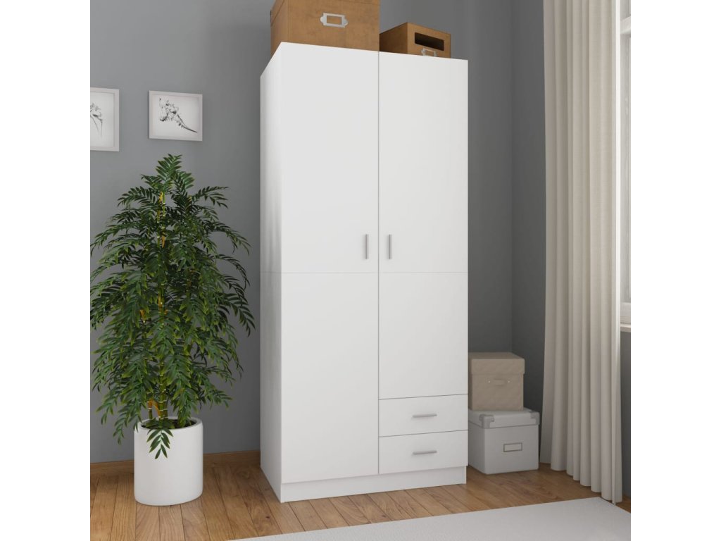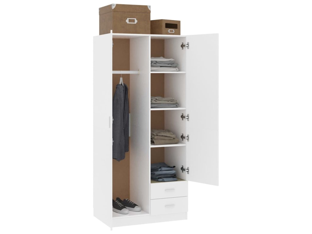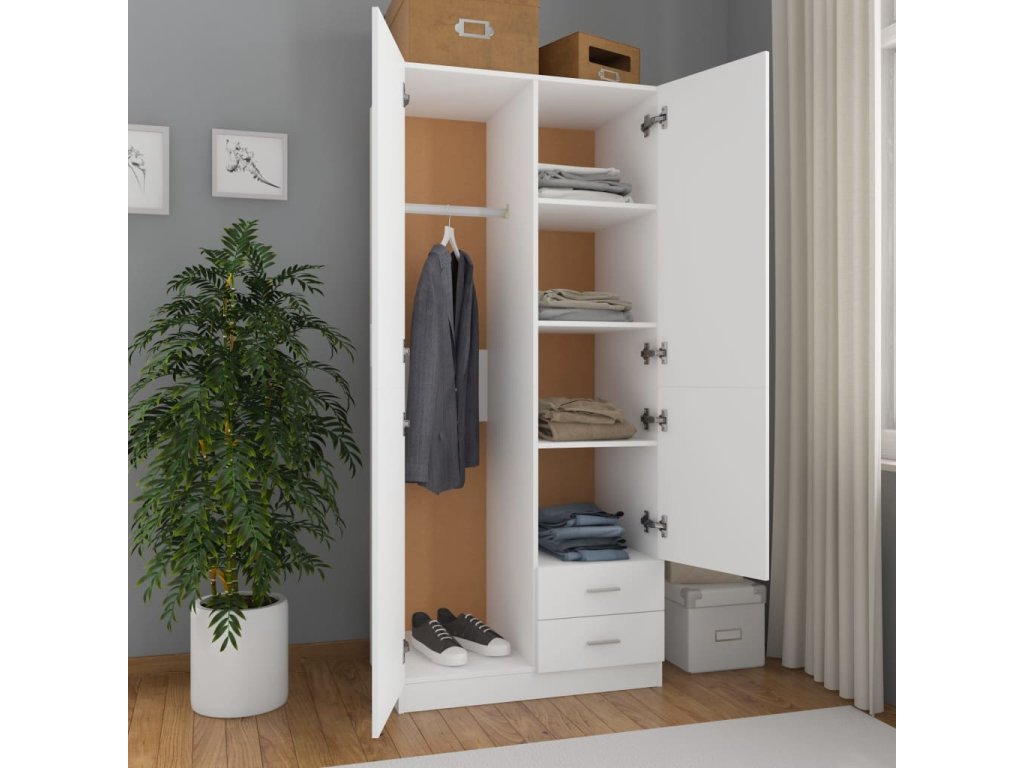Šatník je vyrobený z prémiového kompozitného dreva, vďaka čomu je robustný, trvácny a má dlhú životnosť. Obsahuje 2 zásuvky a veľký priečinok s tyčou na vešiaky, a tak vám poskytne množstvo priestoru na dlhé odevy, ktoré chcete zavesiť na vešiak, aj na poskladané oblečenie a doplnky, ako napríklad svetre, rifle, klobúky, kabelky a podobne.