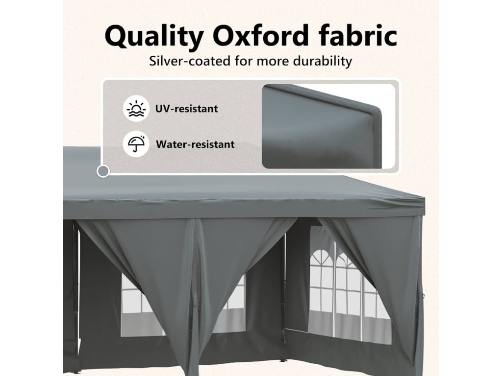 - Oxfordská tkanina 210D: Tento pavilón je vyrobený z oxfordskej tkaniny 210D so strieborným povlakom a má UV a vodeodolnú funkciu. Účinne blokuje škodlivé UV lúče a odoláva aj vlhkosti a daždivému počasiu.