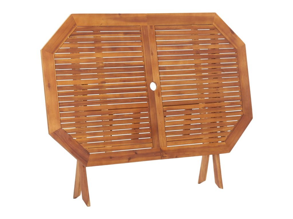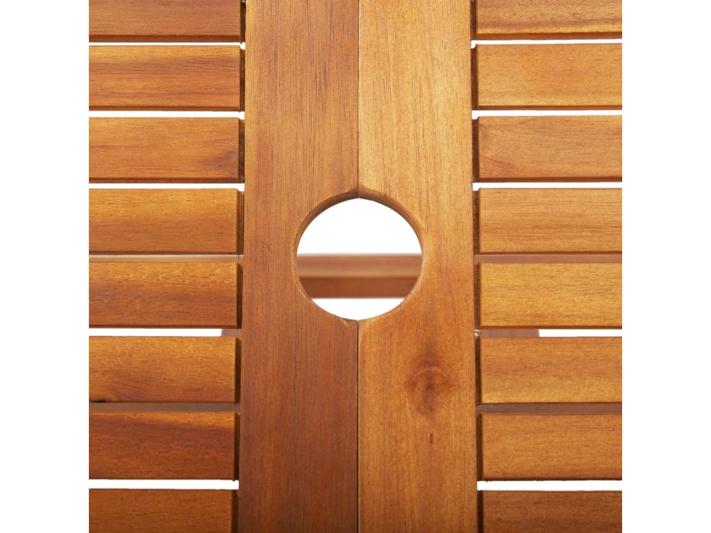 Vonkajší jedálenský stôl je vyrobený z akáciového masívu, tropického tvrdého dreva, ktoré je veľmi trvácne a odolné voči poveternostným vplyvom. V strede stola sa nachádza otvor na pevné uchytenie slnečníka. Bistro stolík sa dá jednoducho poskladať, aby nezaberal veľa miesta, keď sa nepoužíva. Jedálenský stôl je potrebné zmontovať.