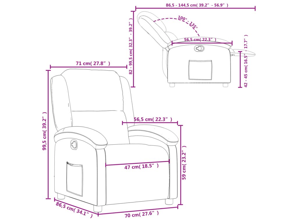 - Rozmery v polohe na sedenie: 71 x 86,5 x 99,5 cm (Š x H x V)