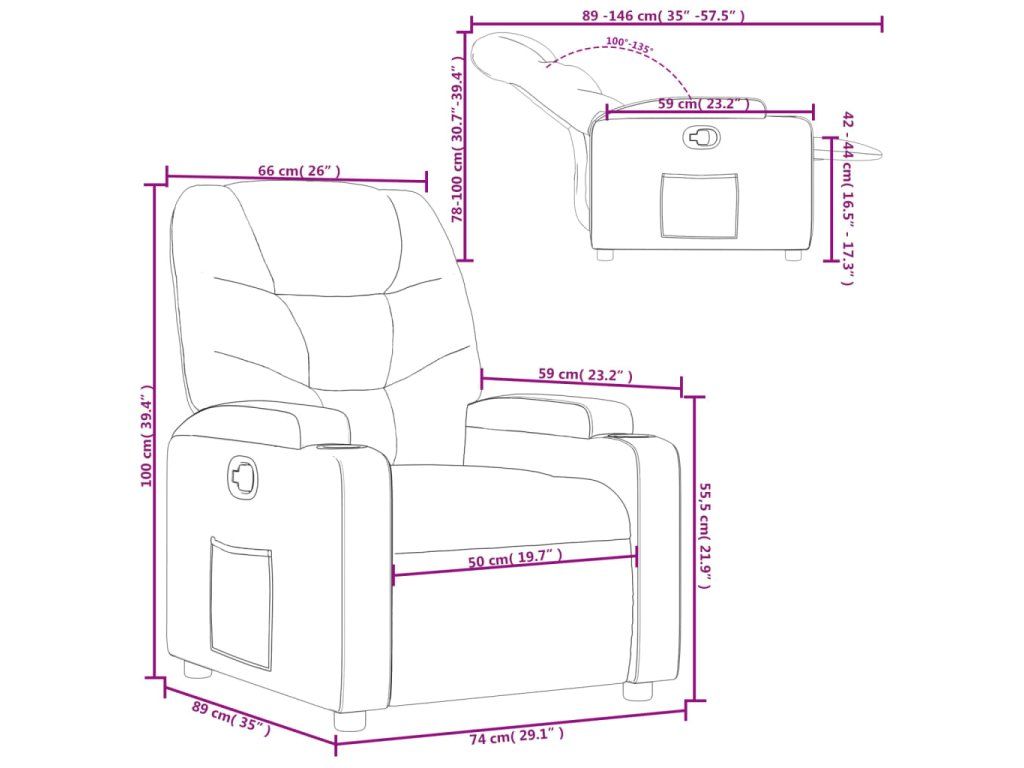 - Rozmery v polohe na ležanie: 74 x 146 x 78 cm (Š x H x V)