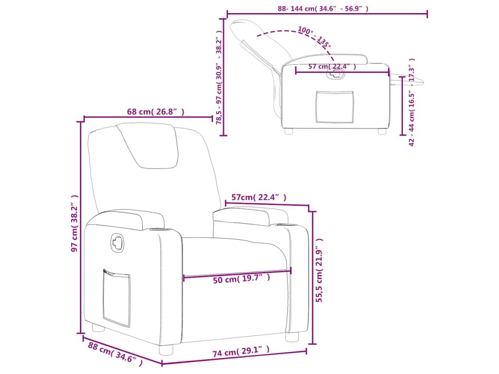 - Rozmery v polohe na sedenie: 74 x 88 x 97 cm (Š x H x V)