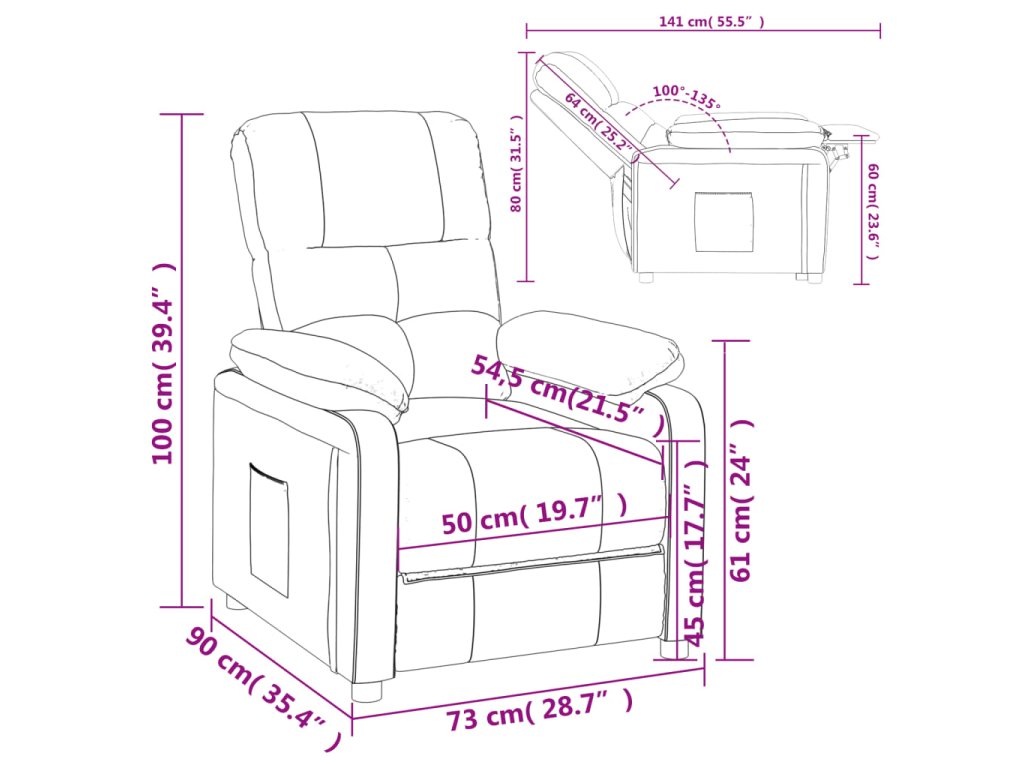 - Rozmery v polohe na ležanie: 73 x 141 x 80 cm (Š x H x V)