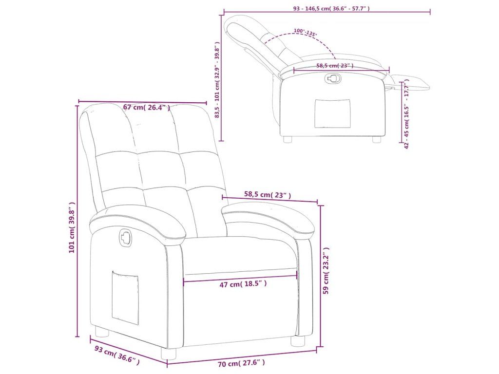 - Rozmery v polohe na ležanie: 70 x 146,5 x 83,5 cm (Š x H x V)