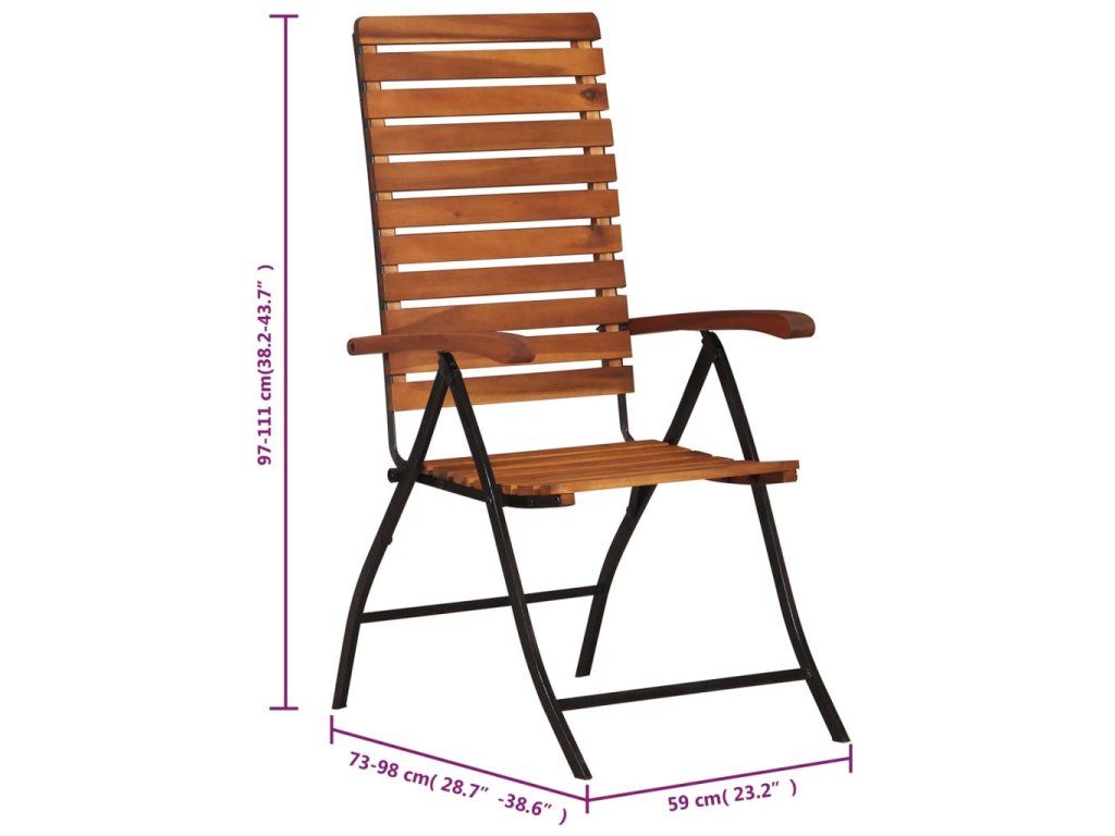 Jedálenské stoličky sú vyrobené z kvalitného akáciového tvrdého dreva, ktoré sa vyznačuje výbornou odolnosťou voči vplyvom počasia a trvanlivosťou. V dôsledku toho sú stoličky ideálne pre použitie vnútri aj vonku. Stabilný oceľový rám dodáva stoličkám stabilitu a odolnosť. Operadlá stoličiek sú nastaviteľné v 5 sklopných nastaveniach, čo vám umožní vždy nájsť tú najpríjemnejšiu polohu. Vďaka ich skladaciemu dizajnu je možné stoličky ľahko skladovať, keď sa nepoužívajú. Tieto vonkajšie stoličky sa ľahko montujú.