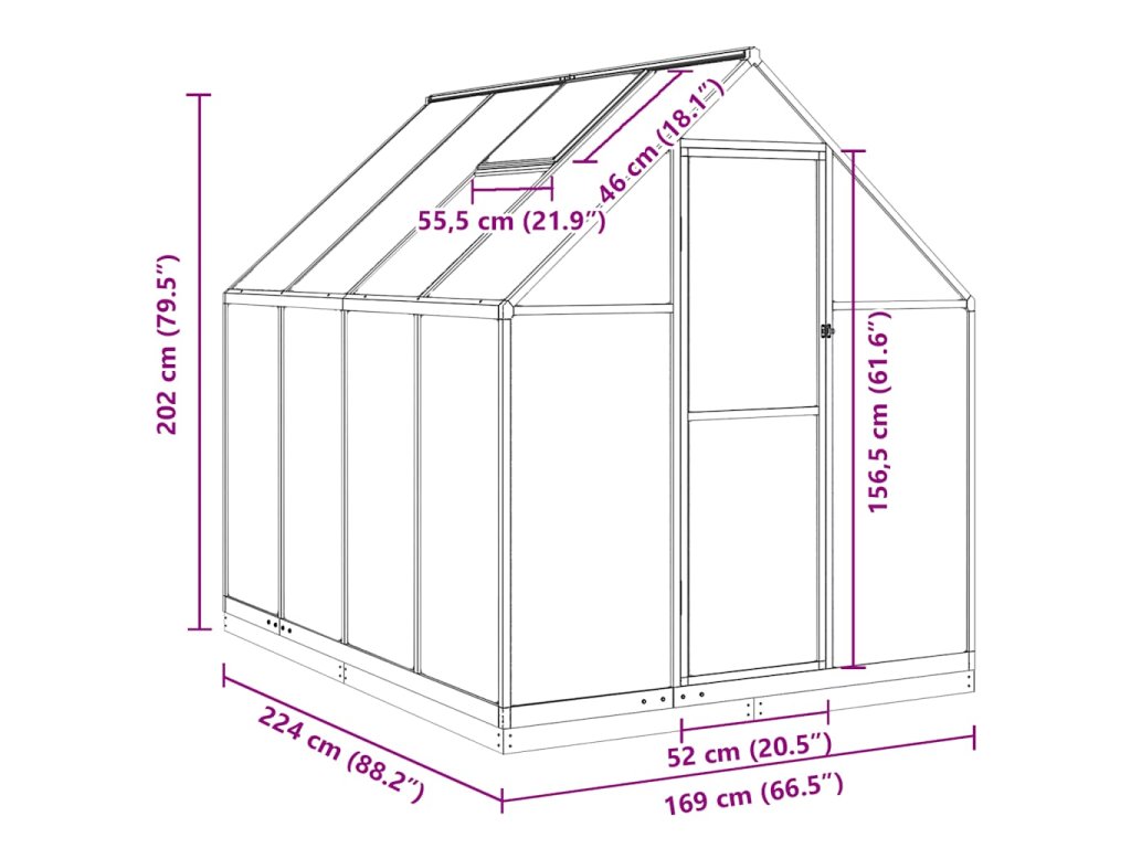- Robustný materiál odolný voči poveternostným vplyvom: Rám skleníka je vyrobený z hliníka odolného voči hrdzi a poveternostným vplyvom, ktorý zaručuje vysokú odolnosť voči vetru a stabilitu. Bočné panely sú vyrobené z polykarbonátových dosiek, ktoré sú odolné voči UV žiareniu, ľahké, trvácne a jednoducho sa udržiavajú a zároveň dokážu odolávať vetru a snehu.