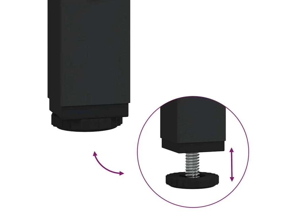 - Nastaviteľné nožičky: Štyri nastaviteľné nožičky s plastovými podložkami udržujú záchodový stojan vyvážený aj na nerovnom teréne a zvyšujú stabilitu.
