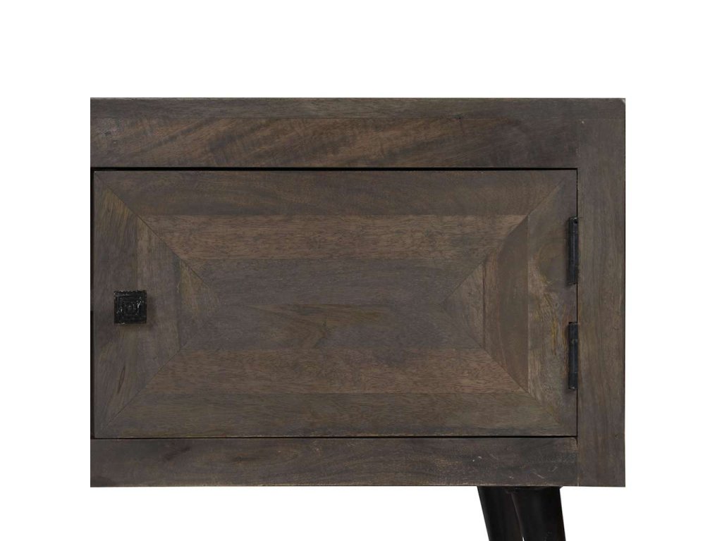 Skrinka je ručne vyrobená z mangového dreva, ktoré je pevné, stabilné, trvácne a krásne, a profesionálne spracovanie len umocňuje jej pôsobivý retro vzhľad. Každý krok procesu výroby sa vykonáva s maximálnou starostlivosťou, či už ide o leštenie alebo lakovanie. Vďaka remeselnému spracovaniu a krásnej textúre dreva je každý kus nábytku jedinečný a trochu odlišný od ostatných kusov. Táto skrinka má pevnú vrchnú dosku, na ktorú môžete položiť rôzne ozdobné predmety, ako napríklad košíky s ovocím alebo vázy. Vďaka 2 policiam a 2 priečinkom vám táto komoda poskytne množstvo priestoru na odkladanie dôležitých predmetov, ktoré potrebujete mať poruke. Na zadnej strane sa nachádza otvor na káble. Oceľové nohy skrinke dodávajú potrebnú stabilitu a umocňujú jej krásny industriálny štýl. Montáž je jednoduchá.