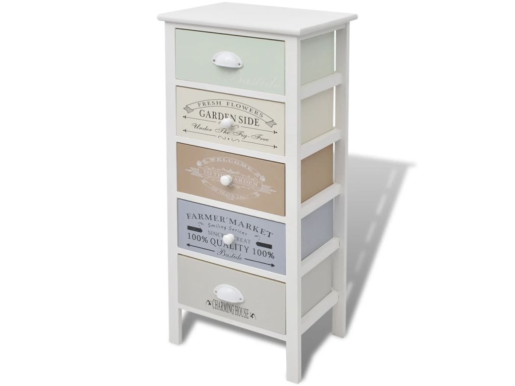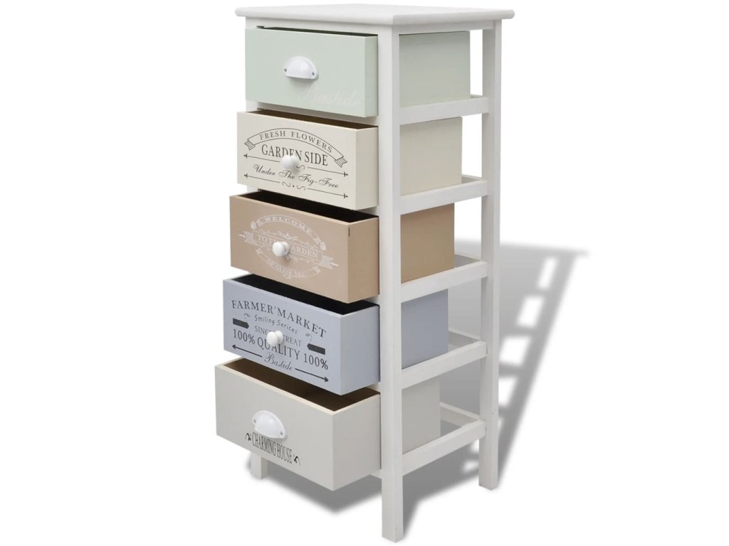 Táto skrinka má 5 zásuviek, ktoré sa hladko vysúvajú a ktoré poskytujú množstvo úložného priestoru na vaše osobné veci, a tak budete mať v izbe vždy poriadok. Zásuvky s potlačou vo vintage vidieckom štýle dodávajú skrinke rustikálny pôvab. Zásuvky sa navyše dajú medzi sebou vymieňať. Na túto skrinku do chodby si môžete položiť napríklad fotky, knihy či kvety v kvetináči. Skrinka je vyrobená z vysokokvalitných materiálov, takže je trvácna a ľahko sa čistí.