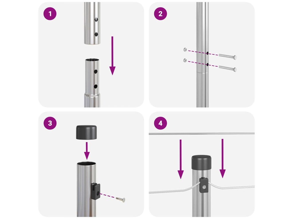 - Zahŕňané komponenty: Tento systém sa jednoducho montuje. Na inštaláciu stačí kladivo a máte hotovo. Skvelé sa hodí ku bránam a oploteniam, poskytuje stabilitu a funkčnosť v rôznych vonkajších prostrediach.