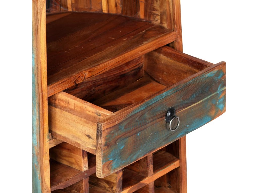 Tento stojan na víno vo vintage štýle sa vďaka svojmu avantgardnému dizajnu zaručene stane stredobodom vášho interiéru. Skrinka na víno je vyrobená z recyklovaného masívu, ktorý pochádza z trámov, podláh a nosníkov zo starých zbúraných stavieb a pozostáva z rôznych typov dreva, ako napríklad borovicového, tíkového, bukového, dubového, cédrového, mangového či akáciového dreva. Recyklované drevo sa vyznačuje všetkými vlastnosťami týchto typov dreva. Je staré, zvetrané a usušené, a preto sa nezmršťuje ani neohýba. Vďaka vynikajúcemu remeselnému opracovaniu a krásnej textúre dreva je každý kus barového nábytku jedinečný a trochu odlišný od ostatných. Skrinka na víno je kompletne ručne vyrobená a každý krok výrobného procesu sa vykonáva s maximálnou starostlivosťou, či už je to leštenie, natieranie alebo lakovanie. Stojan na víno má 16 priehradiek na fľaše, 1 zásuvku a 3 poličky, a tak poskytuje množstvo priestoru na fľaše a ďalšie príslušnstvo.