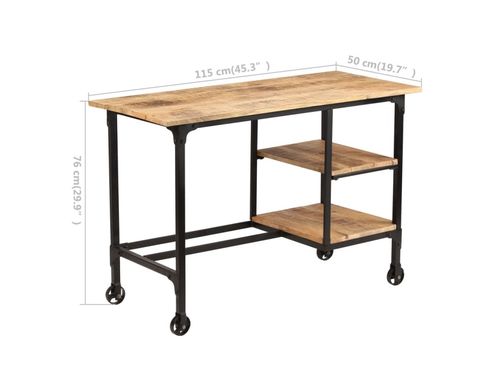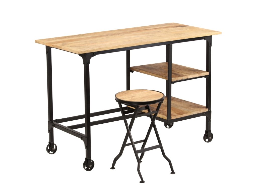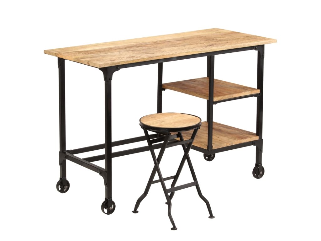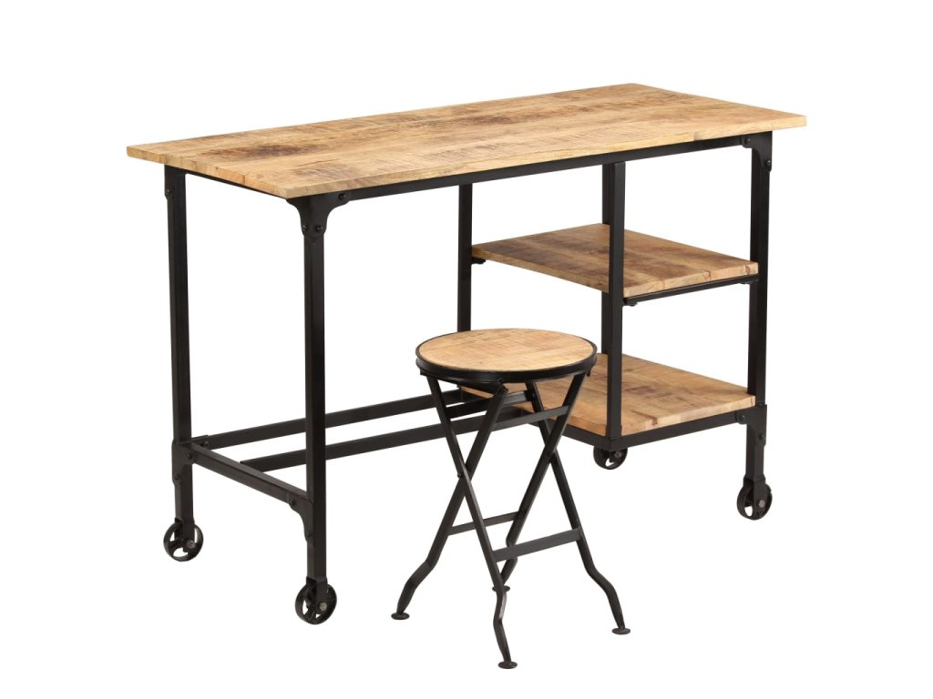 Počítačový stôl a stolička sú vyrobené z masívneho mangovníkového dreva s nádherným lešteným a lakovaným povrchom, ktorý mu dodáva rafinovaný vzhľad. Krásna štruktúra dreva robí každý kus nábytku jedinečným a trochu odlišným od ostatných. Tento písací stôl je vybavený dvoma policami, ktoré poskytujú dostatok priestoru na ukladanie a organizovanie vašich šanónov, papierov, dokumentov a iných súkromných vecí. Vďaka integrovaným kolieskam sa stôl jednoducho posúva. Práškovaný oceľový rám prispieva k stabilite stola a stoličky, a dodáva im priemyselný štýl. Stolička môže byť zložená pre ľahkú prepravu a skladovanie. Montáž je jednoduchá. Balenie obsahuje písací stôl a skladaciu stoličku.