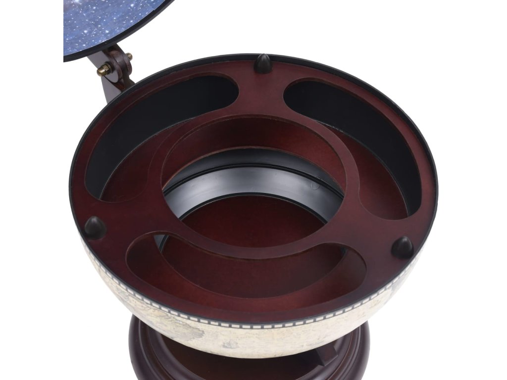 Drevený glóbus sa dá otvoriť a v jeho vnútri sa nachádza veľký otočný bar s množstvom priestoru na víno, likéry, nápoje a poháre, takže si budete môcť svoje vínové fľaše a poháre úhľadne uložiť a zároveň k nim budete mať jednoduchý prístup.