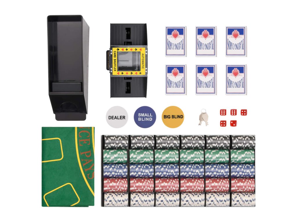 - Profesionálna pokrová súprava: Táto súprava obsahuje 5 kociek, 1 box na karty, 6 balíčkov kariet, 6 držiakov na žetóny, 1 automatický miešač kariet, 1 hraciu podložku, 1 gombík krupiéra, 1 gombík malý blind, 1 gombík veľký blind a 600 žetónov.
