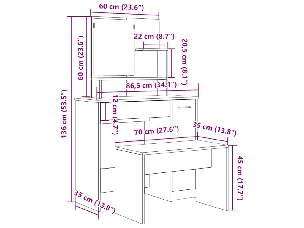- Rozmery toaletného stolíka: 86,5 x 35 x 136 cm (Š x H x V)