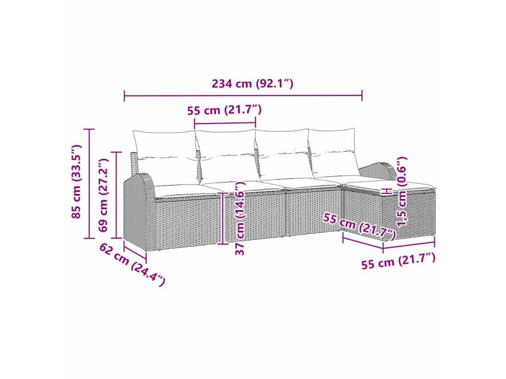 • Pohodlné komponenty: Každý kus sofa má polstrované polyesterové vankúše, ktoré zaručujú pohodlné sedenie. Odnímateľné obaly na vankúše uľahčujú pranie a údržbu, takže tvoj vonkajší nábytok bude stále čerstvý a príjemný.