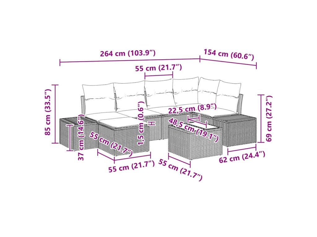 - Komplexné komponenty: Set obsahuje sériu dobre polstrovaných sedadiel s ratanovými operadlami, všetko navrhnuté pre pohodlné sedenie. Venkovní vankúše sú z odolnej látky, pripravené na dážď aj slnko.