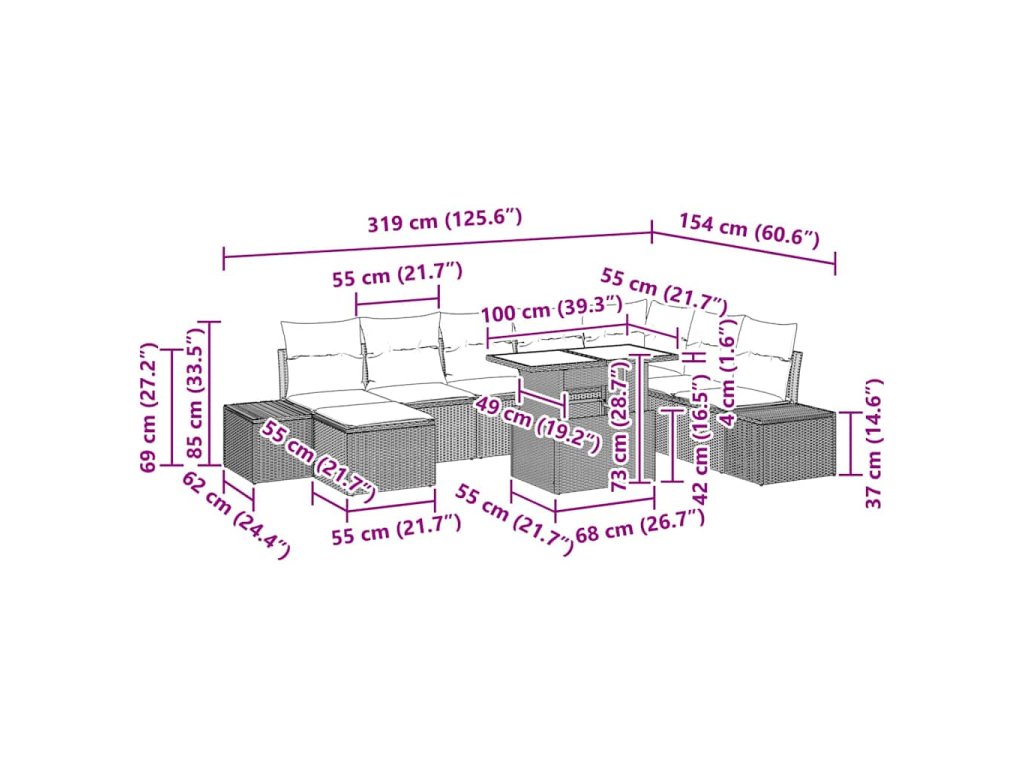 • Obsah komponentov: Set obsahuje dve bočné pohovky, štyri stredové sedadlá, rohové sedadlo, podnožku a stôl, s dostatkom miesta na sedenie. Každý kus je z poly ratanu, ktorý spojuje štýl a trvácnosť. Vankúše sú plnené polyesterom pre maximálne pohodlie.