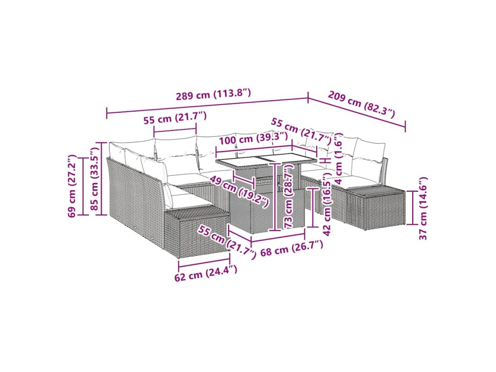 - Obsahované komponenty: Set obsahuje dva bočné gauče, dve rohové sedadlá, päť centrálnych sedadiel a stôl so skleneným povrchom, všetko navrhnuté na pohodu a variabilitu.