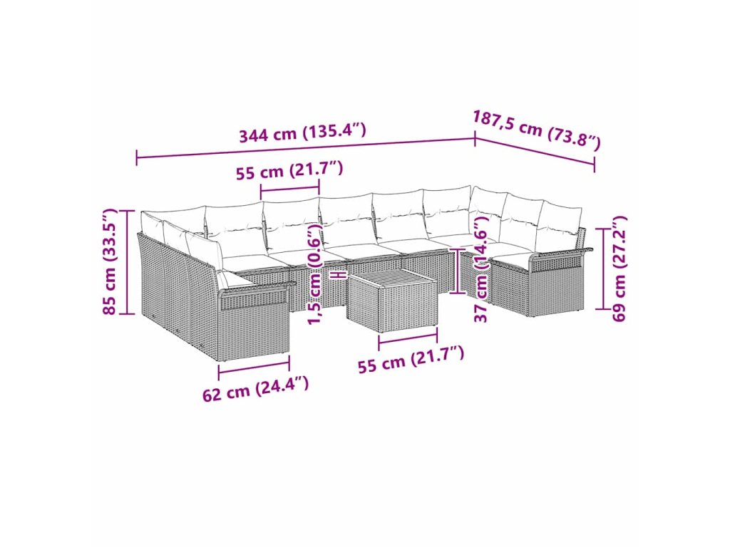 - 6 x Stredný sedák: 55 x 62 x 85 cm (D x Š x V)