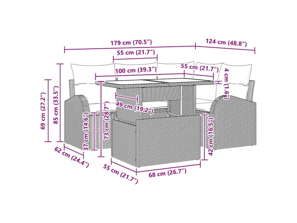 - Všetky komponenty sú zahrnuté: Set obsahuje všetko, čo potrebujete: jednu rohovú sedačku, dve arm pohovky, strednú sedačku a štýlový stolík. Každý kus je navrhnutý na pohodlie, pričom podložky sú vyrobené z polyesteru a peny, aby váš zážitok z posedenia bol čo najlepší. Tieto kusy dokonale ladia a zaisťujú koherentný vzhľad na vašej terase.