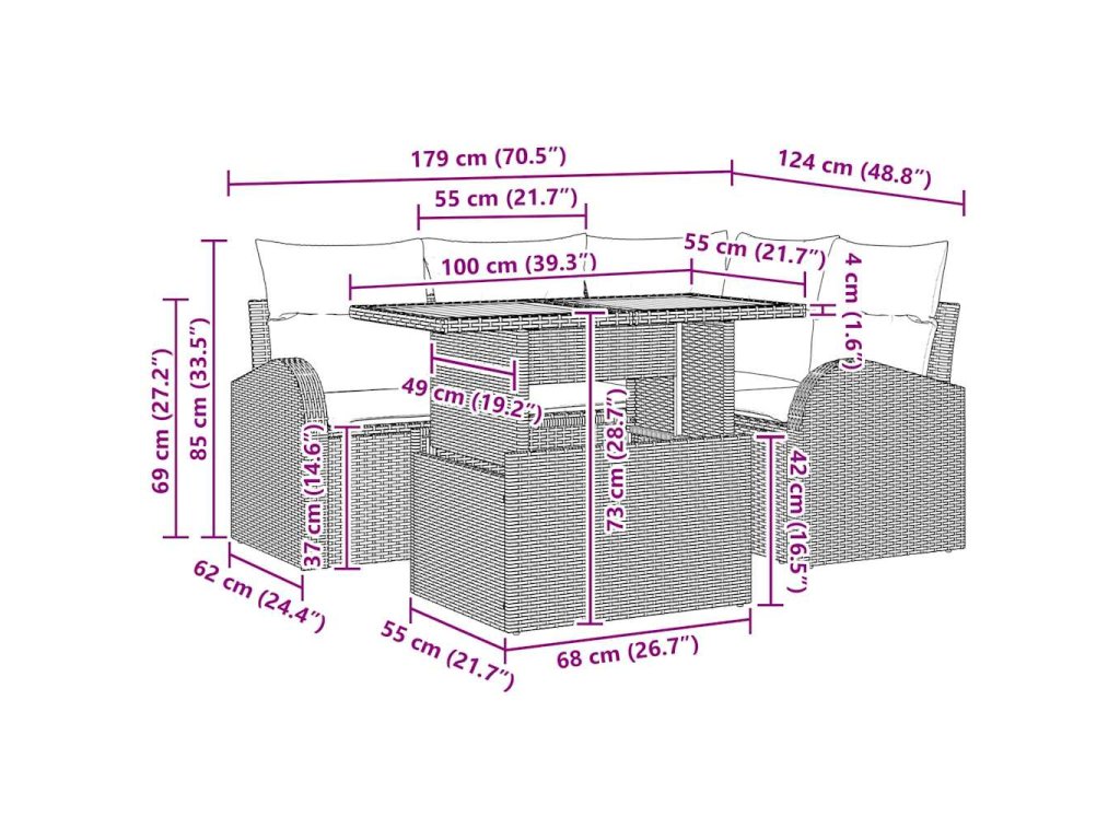 - Univerzálna Konštrukcia: Je navrhnutý s praktickými prvkami ako kreslá s úložným priestorom, rohové sedenie, stredné sedenie a flexibilný záhradný stôl. Zakrivené poly ratanové opierky rúk dávajú pohodlnú oporu a pekný vzhľad zo všetkých uhlov.