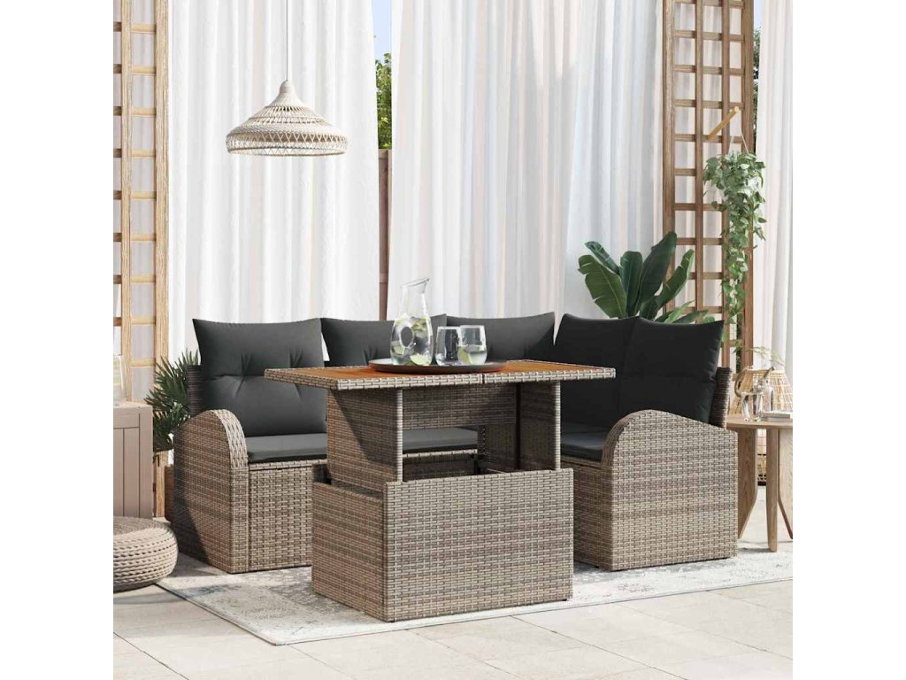- Kvalita Materiálu: Set je vyrobený z poly ratanu, ocele so životnosťou a masívneho akáciového dreva, takže zvláda aj nepriaznivé počasie. Poly ratan vyzerá fajn a je odolný, zatiaľ čo práškovaná oceľ dodáva potrebnú pevnosť. Akáciové drevo pridáva prírodný prvok. Tieto materiály spolu robia set štýlovým a pevným.