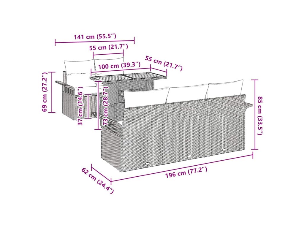 - Praktické komponenty: Set má starostlivo navrhnuté prvky, ako sú zakrivené opierky a kvalitné vankúše s obalom na zips. Každý kúsok je navrhnutý pre maximálne pohodlie.