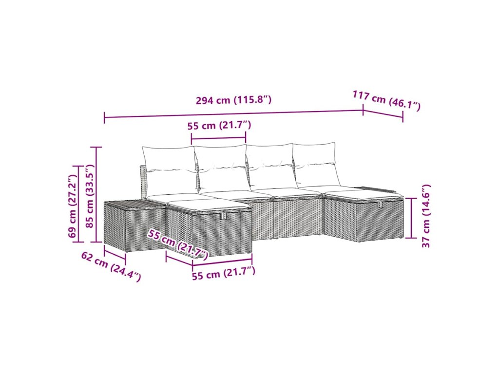 - Materiály: Vyrobené z polyratanu a polyesteru, tento pohovkový set je trvanlivý a má super vzhľad. Polyratan je pevný, takže vydrží slnko a dážď. Pridaním polyesteru sa zvyšuje pohodlie, takže sedenie je nielen pekné, ale aj prijemné.