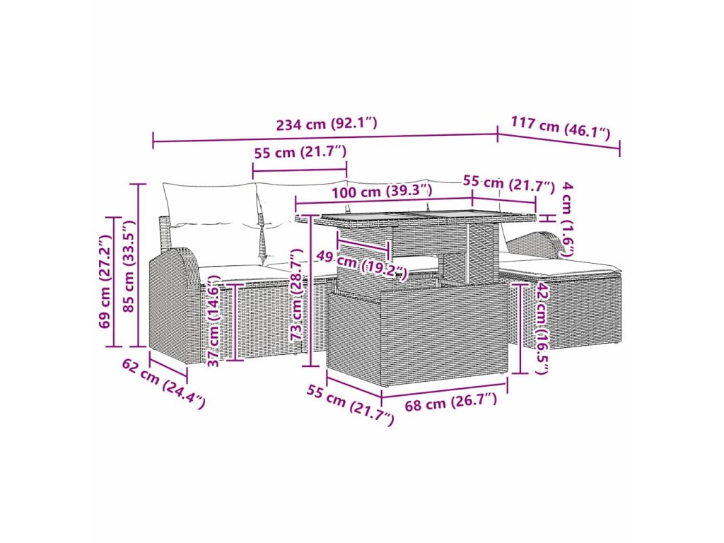 - Úplne Vybavené Komponenty: Set obsahuje 2 kreslá, 2 centrálne sedadlá a taburetku, všetko s praktickými úložnými funkciami. Záhradný stôl sa skvele hodí, ideálny na rôzne stretnutia. Každý kus je navrhnutý tak, aby efektívne využil váš vonkajší priestor.
