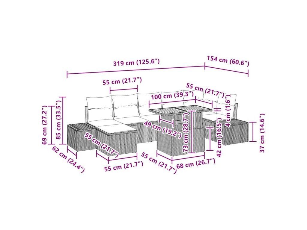 - Obsahuje komponenty: Obsahuje pohodlné vankúše plnené penou, pevné štvorcové opierky na ruky a modulárne usporiadanie, ktoré si môžeš prestaviť podľa svojich predstáv. Získaš dva bočné gauče, jedno rohové sedenie, tri stredné sedenia, taburetku a stôl, všetko so skladovaním na tvoje potreby.