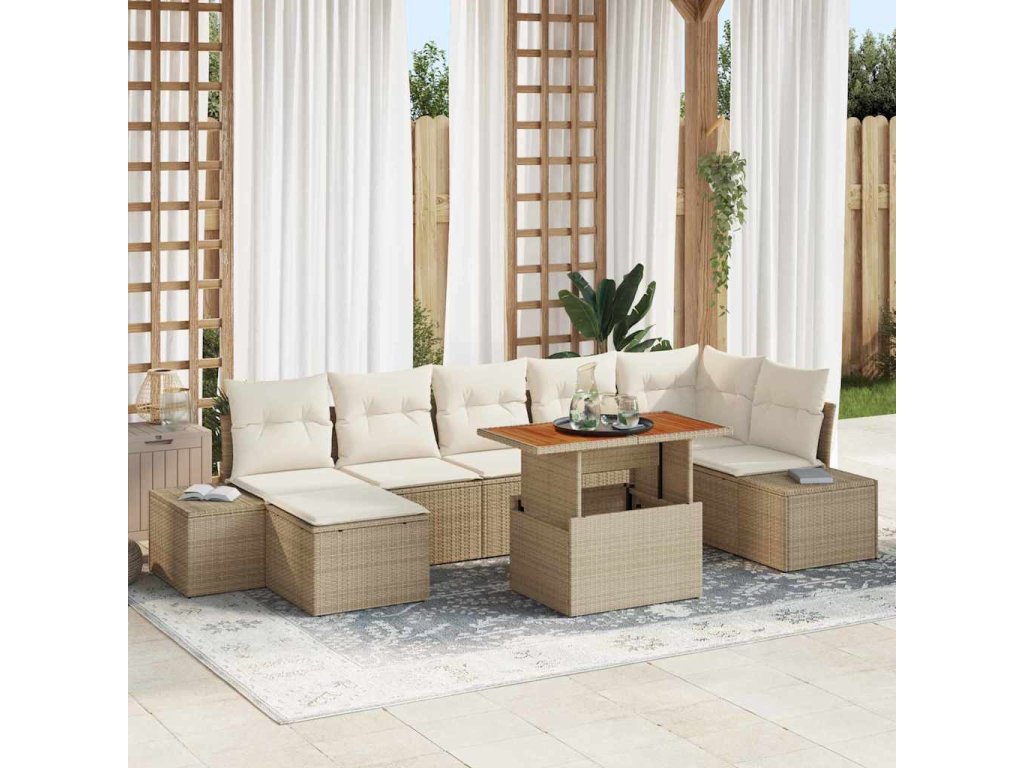 - Materiály: Vyrobené z polyratanu a masívneho akáciového dreva, tento záhradný gaučový set je navrhnutý tak, aby vydržal. Poly ratan je odolný voči UV lúčom, takže si ho môžeš užívať na slnku roky, zatiaľ čo masívne akáciové drevo dodáva kúsok prírodného pôvabu.