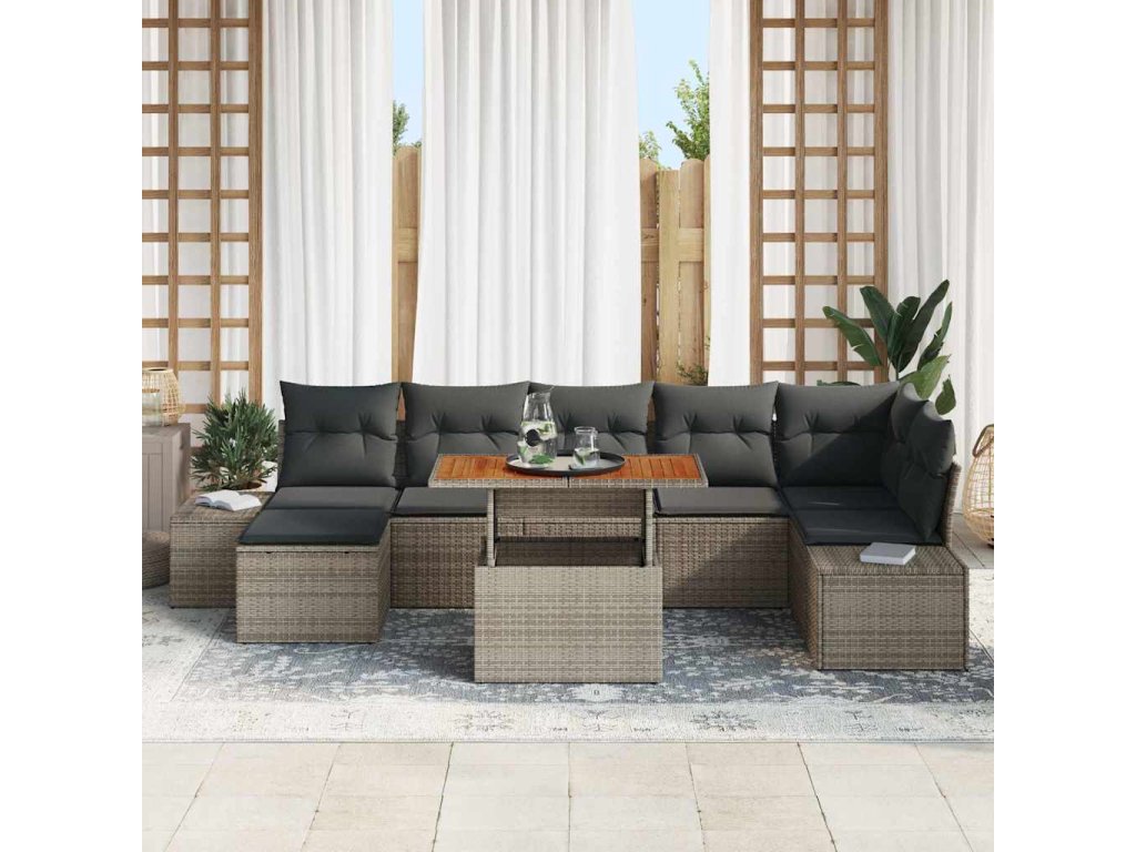 - Materiály: Vyrobené z polyratanu a masívneho akáciového dreva, tento záhradný gaučový set je navrhnutý tak, aby vydržal. Poly ratan je odolný voči UV lúčom, takže si ho môžeš užívať na slnku roky, zatiaľ čo masívne akáciové drevo dodáva kúsok prírodného pôvabu.