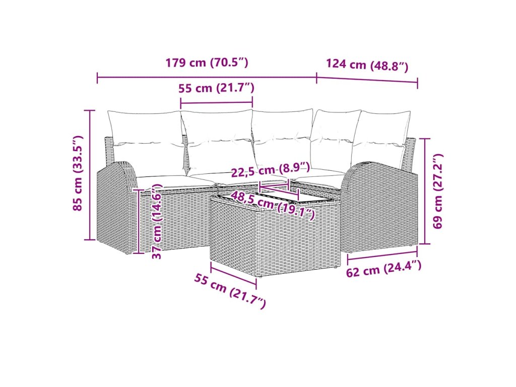 Tento záhradný pohovkový set je vrcholom vonkajšieho oddychu s jeho elegantným obdĺžnikovým tvarom a moderným štýlom. Je super pre záhrady a terasy, ponúka pohodlie a štýl, a je ideálny na letné posedenia. Jeho čisté línie a funkčná povaha sa páčia súčasným štýlom, umožňujú vám užiť si pekný vzhľad aj praktickosť vo vašej vonkajšej obývačke.