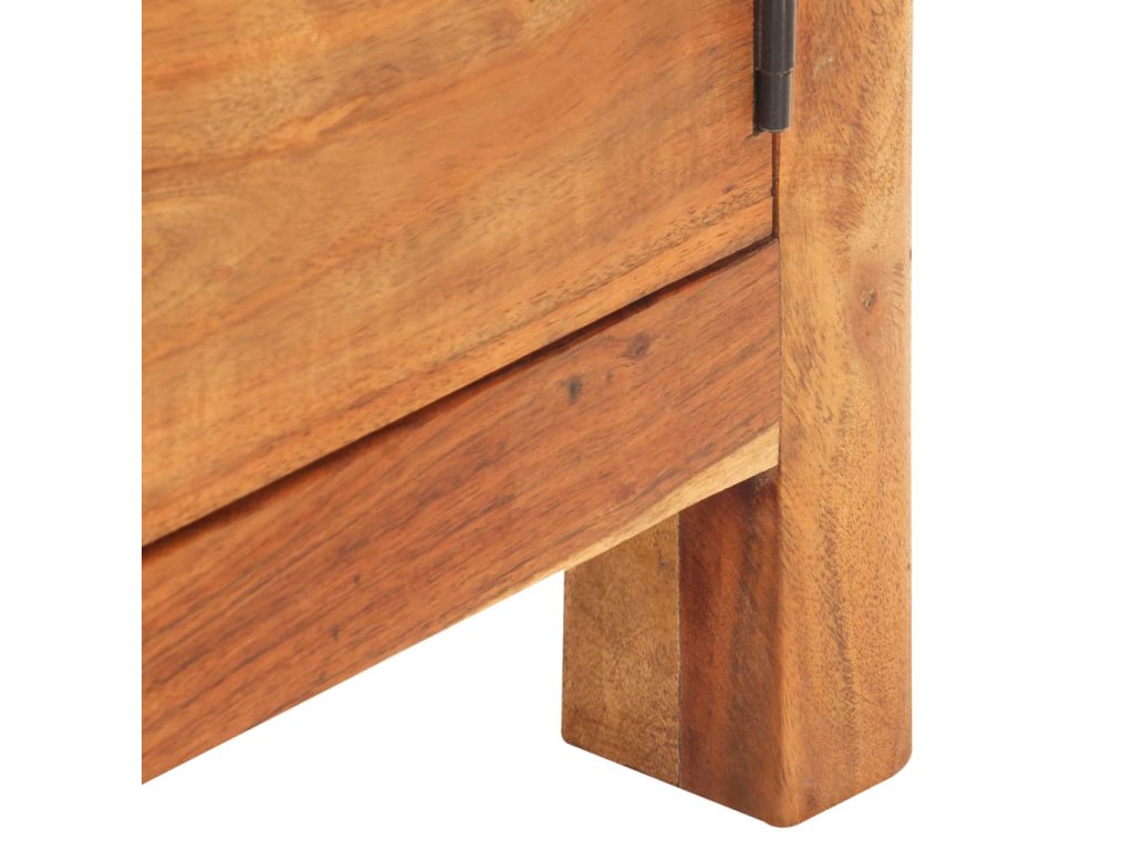 Stereo skrinka je vyrobená z masívneho akáciového dreva s prírodnou povrchovou úpravou, vďaka čomu je stabilná a odolná. Vďaka remeselnému spracovaniu a krásnej štruktúre dreva je každý kus nábytku jedinečný a mierne odlišný od ostatných. Multimediálna skrinka má tiež dve dvierka, zásuvku a poličku, ktoré poskytujú dostatok úložného priestoru. Okrem toho možno robustnú hornú časť použiť na vystavenie dekoratívnych predmetov, ako sú fotorámiky, rastliny v kvetináčoch, vázy atď.