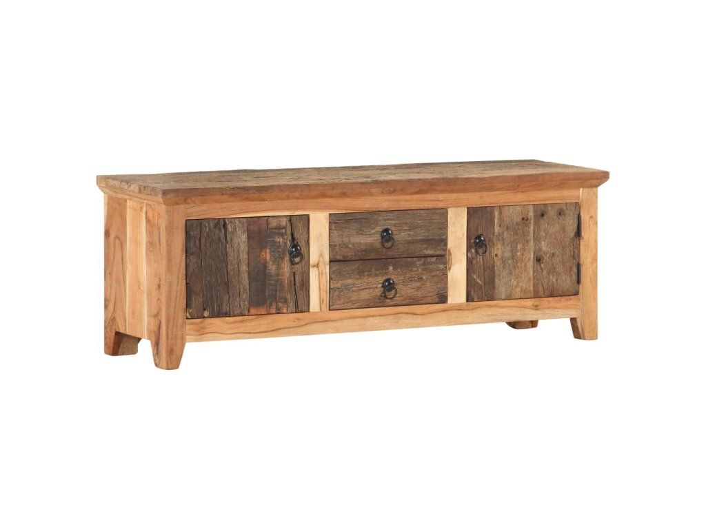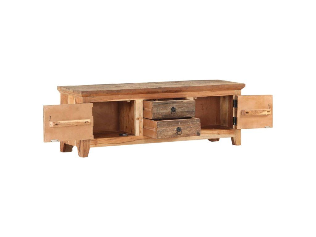 TV stolík je vyrobený z masívneho akáciového a recyklovaného dreva. Recyklované drevo pochádza z trámov, podláh a nosníkov zo starých zbúraných budov. Môže pozostávať z rôznych druhov dreva, ako je borovica, tík, dubové drevo, mangovníkové drevo, akáciové drevo atď. To znamená, že recyklované drevo si zachováva vlastnosti týchto rôznych druhov dreva. Recyklované drevo je už odležané, zvetrané a vysušené, preto sa nezmršťuje ani neohýba. Tento stereo stolík obsahuje 2 priečinky a 2 zásuvky, a poskytuje dostatok priestoru na úhľadné usporiadanie rôznych predmetov.