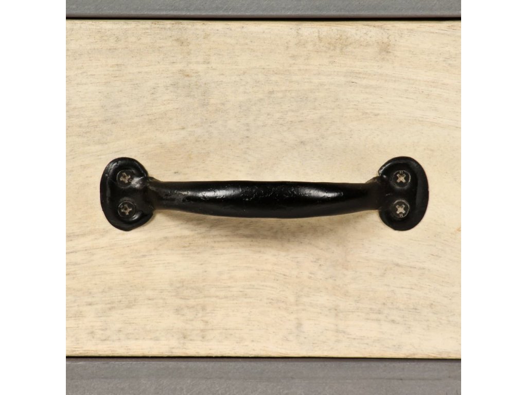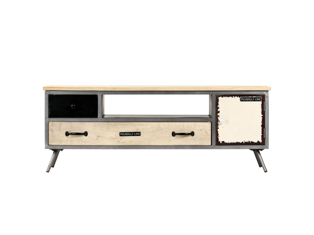 Skrinka je vyrobená z masívneho mangovníkového dreva, ktoré dostalo krásnu povrchovú úpravu leštením a lakovaním, vďaka čomu má rafinovaný vzhľad. Vďaka krásnej kresbe dreva je každý kus nábytku jedinečný a trochu odlišný od ostatných kusov. Táto TV jednotka má pevný a stabilný povrch, na ktorý môžete umiestniť TV, ovocný kôš, vázu alebo iné dekoratívne predmety. Skrinka má 2 zásuvky, 1 priehradku a 1 skrinku a poskytuje dostatok priestoru na odloženie vašich multimediálnych zariadení, kníh a rôznych iných položiek. Oceľový rám dodáva skrinke nielen odolnosť a stabilitu, ale aj priemyselný štýl. Montáž je jednoduchá.